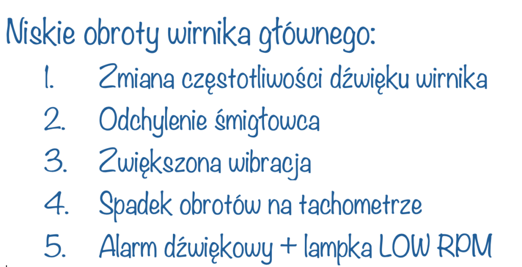 Reakcją jest jednoczesne opuszczenie dźwigni skoku ogólnego oraz otwarcie przepustnicy. W utrzymaniu obrotów pomaga również przesunięcie drążka „na siebie” (jeśli tylko nasza prędkość pozwala na taki manewr). Sytuacja, w której doprowadzimy do spadku obrotów wirnika, a w konsekwencji do jego przeciągnięcia, jest nie do uratowania. Jak głosi jedna z trzech złotych zasad Boba Muse’a (Głównego Instruktora oraz Dyrektora Bezpieczeństwa) – strać obroty, a stracisz życie. Odpowiednie zarządzanie energią i świadomość, że energia z wirnika jest bardzo ograniczona są kluczowymi składowymi bezpiecznego latania na śmigłowcach Robinson.