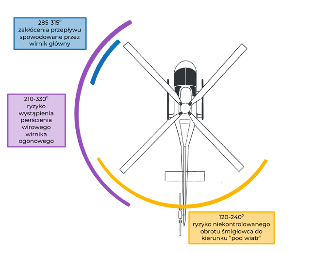 - Wiatr z tyłu (120-240°) powoduje niestabilność śmigłowca związaną z ryzykiem niekontrolowanego obrotu, śmigłowiec niejako sam „próbuje” ustawić się pod wiatr.