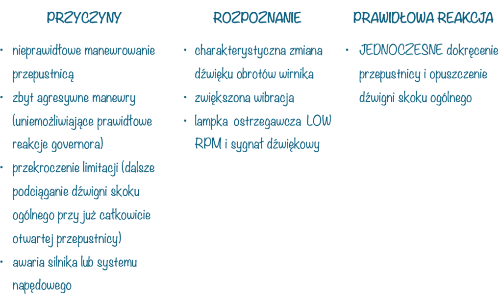 Spadek obrotów wirnika, niskie obroty i w konsekwencji przeciągnięcie wirnika