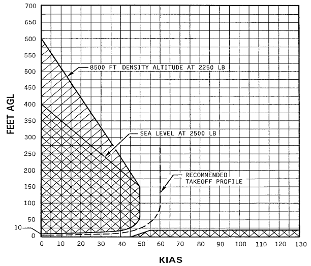 Poniżej znajduje się wykres HV dla śmigłowca Robinson R44 Raven II. Jego zakreskowane obszary to kombinacje niebezpieczne i choć nie zawsze jesteśmy w stanie zupełnie je wyeliminować, to naszym celem powinna być minimalizacja czasu, w jakim w nich przebywamy. Warto podkreślić warunki, w jakich wykres ten ma zastosowanie, czyli pilot o umiarkowanych zdolnościach (average skilled pilot), brak wiatru, równa i twarda powierzchnia przyziemienia.