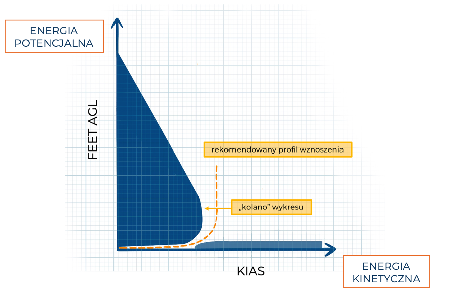 W swojej istocie wykres H/V jest przede wszystkim zapisem relacji energetycznych. Obejmuje on energię potencjalną wynikającą z wysokości, energię kinetyczną związaną z prędkością postępową oraz energię zgromadzoną w bezwładności wirnika. Do wykonania bezpiecznej autorotacji konieczny jest odpowiedni zapas tych form energii. Energia potencjalna wysokości zamieniana jest w pierwszej fazie na energię kinetyczną ruchu, która w końcowej fazie autorotacji przekształcana jest w energię obrotową wirnika. To właśnie zapas obrotów wirnika umożliwia kontrolowane przyziemienie, decydujące bezpośrednio o przeżywalności zdarzenia. Na uwagę zasługuje tak zwany obszar „kolana” wykresu, czyli kombinacji o wyjątkowo niekorzystnym bilansie energetycznym, w którym pilot nie dysponuje ani zapasem wysokości ani prędkości. W efekcie znajduje się w sytuacji, w której nie ma wystarczającej wysokości, aby „wymienić ją” na prędkość, ani wystarczającej prędkości, aby wygenerować efektywną autorotację. Operowanie w tym rejonie często wymaga bardzo precyzyjnych, niemal natychmiastowych reakcji, a margines błędu jest wyjątkowo niewielki.
